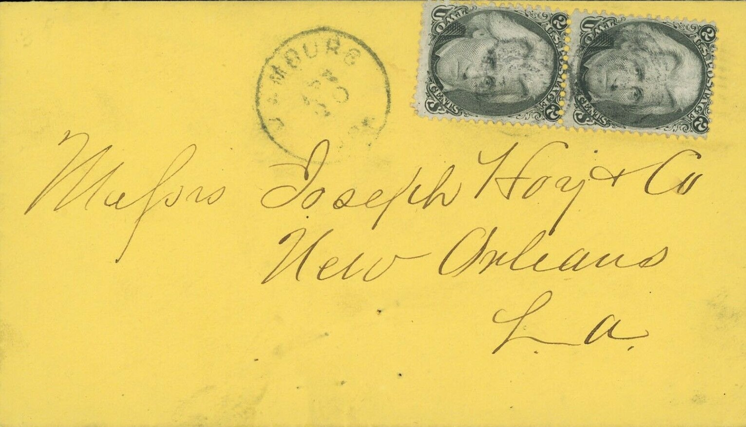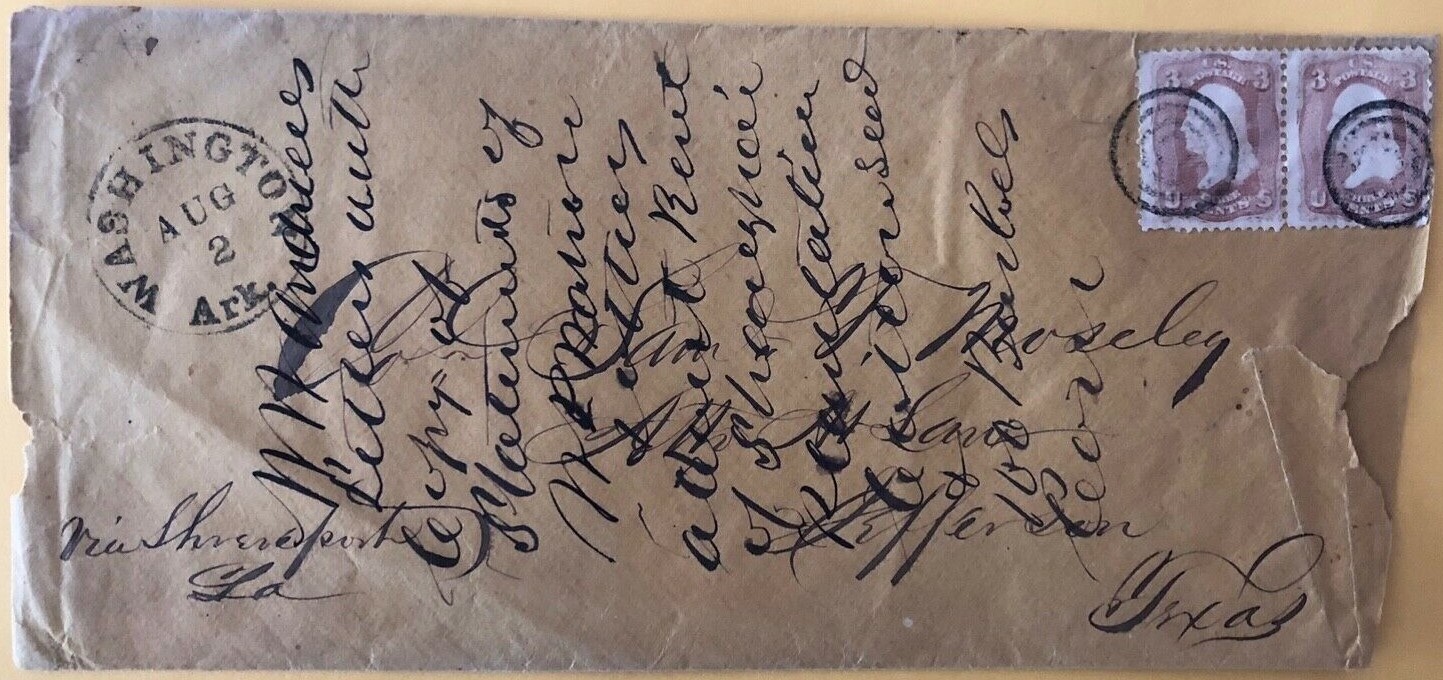 | Washington | 186x-08-02 | Jefferson, Texas via Shreveport LA | Pair of #65 on legal sized envelope to John Mosley | Washington AR 186x-08-02 to Jefferson Tx eBay20220202.jpg |