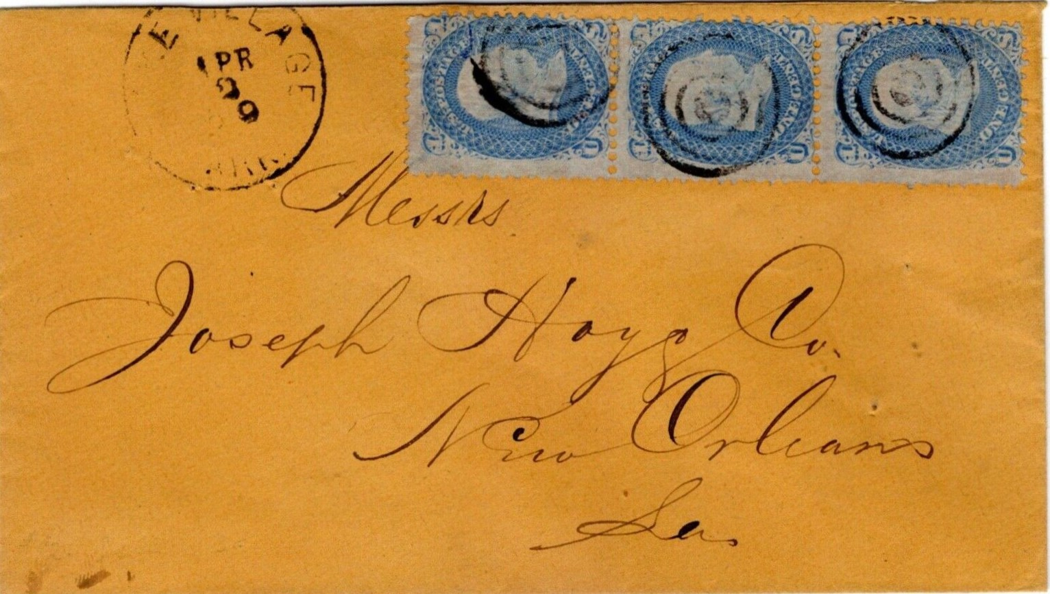 | Cincinnati | 1867-07-10 | Saint Joseph, Missouri | Manuscript town name, pen cancelled 3 cent adhesive, yellow cover | Cincinnati AR 1867-07-10 to St Joe MO eBay20150415.JPG |