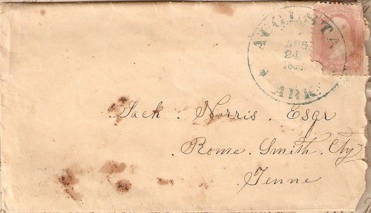 | Augusta | 1866-08-24 | Rome, Tennessee | Large CDS with M-D-Y ties damaged 3 cent adhesive on torn envelope | Augusta AR 1866-08-24 eBay20150105.JPG |