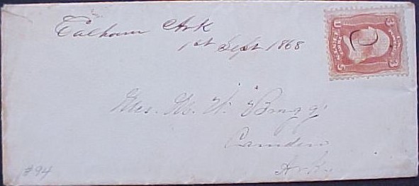 | Calhoun | 1868-09-01 | Canadian, New York | Manuscript town name, pen cancelled 3 cent adhesive, blue cover | Calhoun AR 1868-09-01 eBay20150415.JPG |