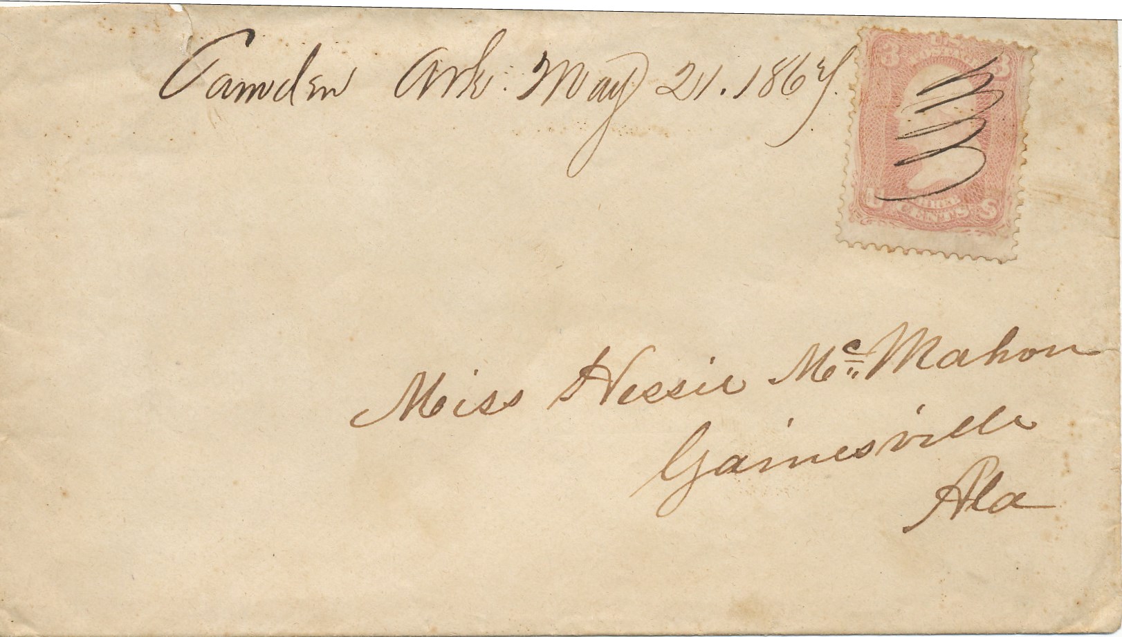| Camden | 1867-05-21 | Gainesville Alabama | 3c 1861 not tied w pen cancel, Manuscript "Camden Ark May 21 1867" | Camden AR 1867-05-21 BRoberts Coll 20181226.jpg |