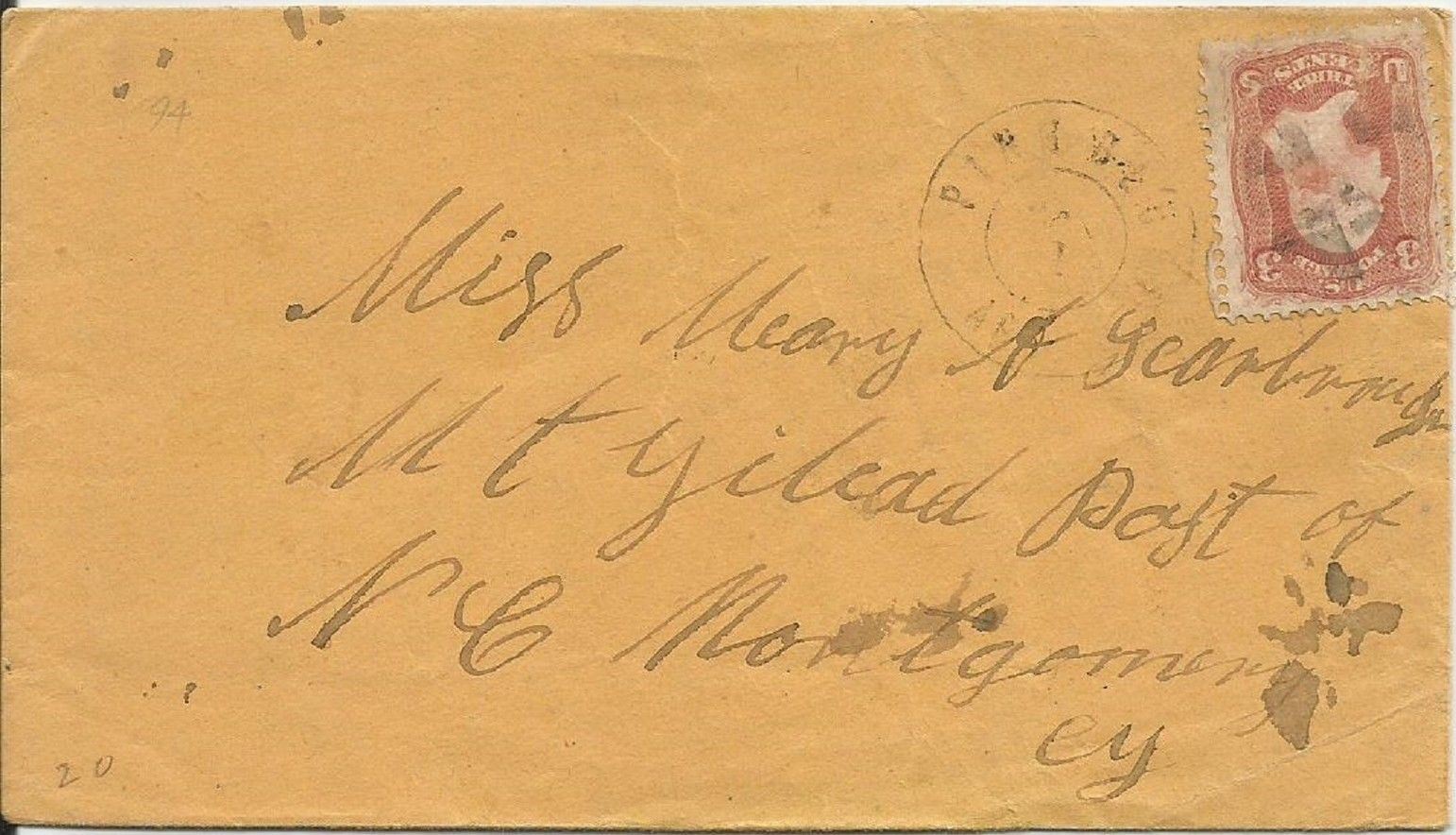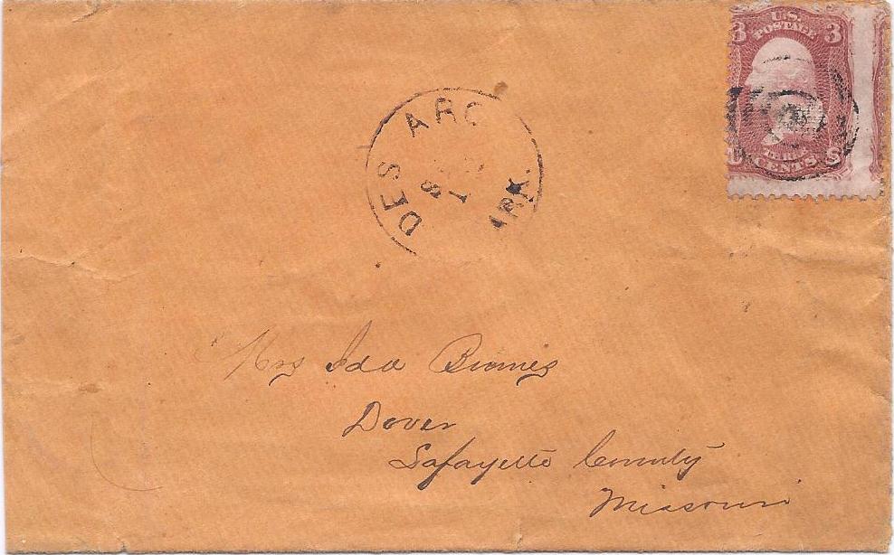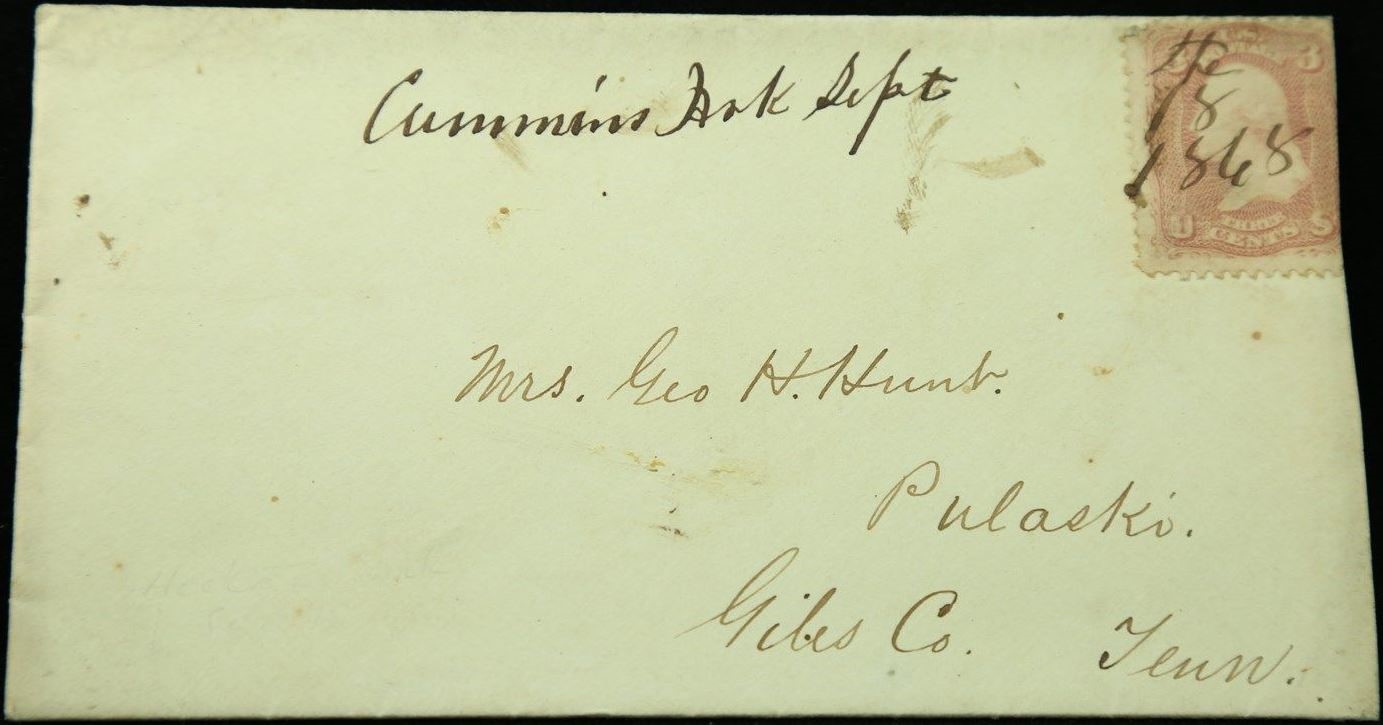 | Cummins | 1868-09-18 | Pulaski, Tennessee | Manuscript town name, pen cancelled 3 cent adhesive, white cover | Cummins AR 1868-09-18 eBay20160816.jpg |