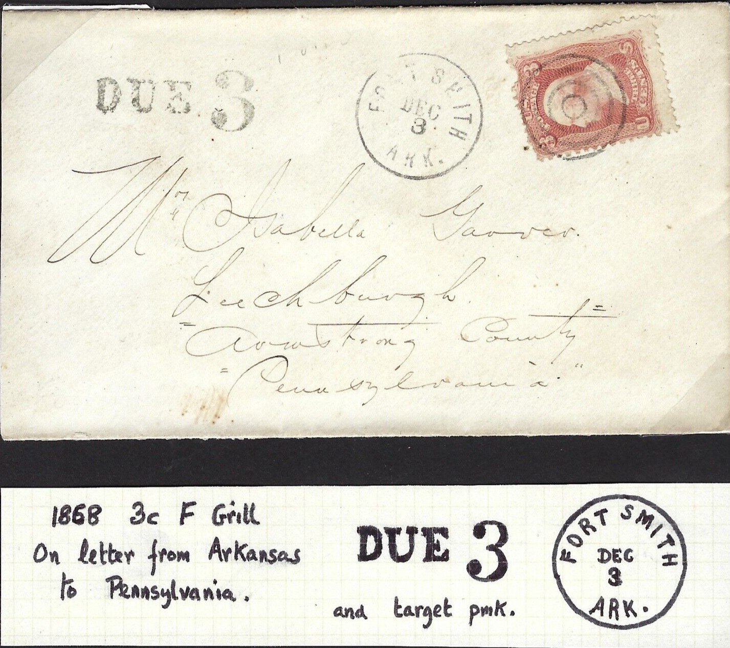| Fort Smith | 1868-12-03 | Liechburg, Pennsylvania | Black CDS, Hndsmp DUE 3, 3c F grill | Fort Smith 1868-12-03 Due 3 3c Grill eBay20230111.jpg |