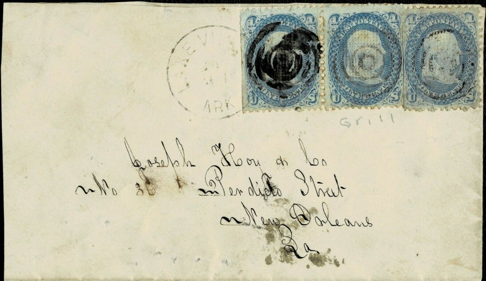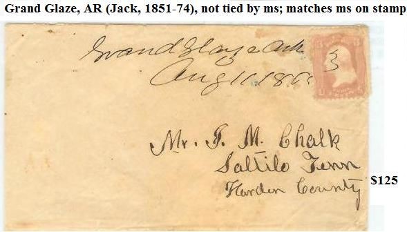 | Grand Glaze | 1866-08-11 | Saltilo, Tennessee | Manuscript town name, pen cancelled 3 cent adhesive, white cover | Grand Glaze AR 1866-08-11 No 65 DTocher_NetPrice 4-4-11.jpg |
