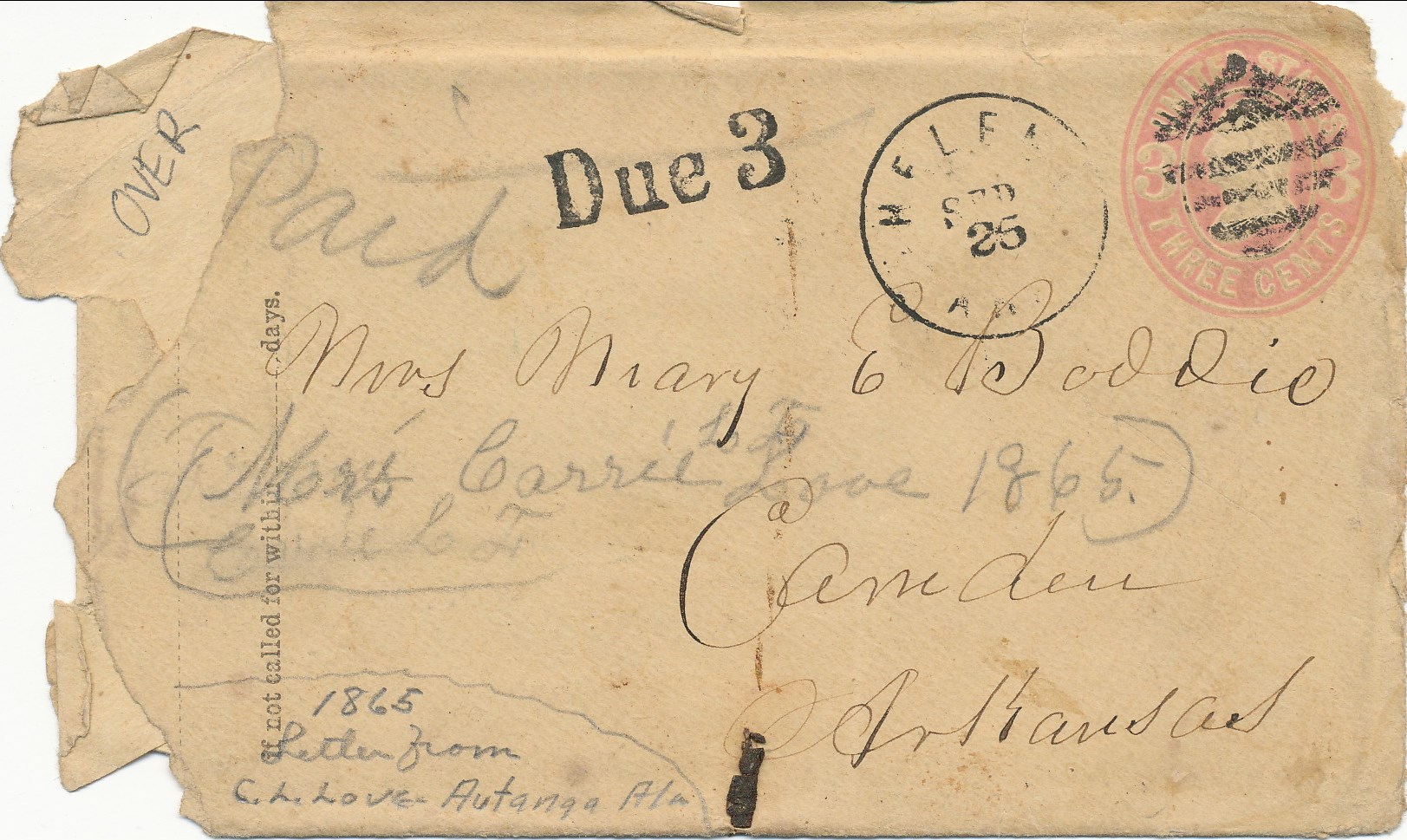 | Helena | 1865-09-25 | Camden Arkansas | 3c Stationary tied by Shield Cancel, Hsp black "Due 3" | Helena AR 1865-09-25 Shield cancel BRob Coll 20181226.jpg |