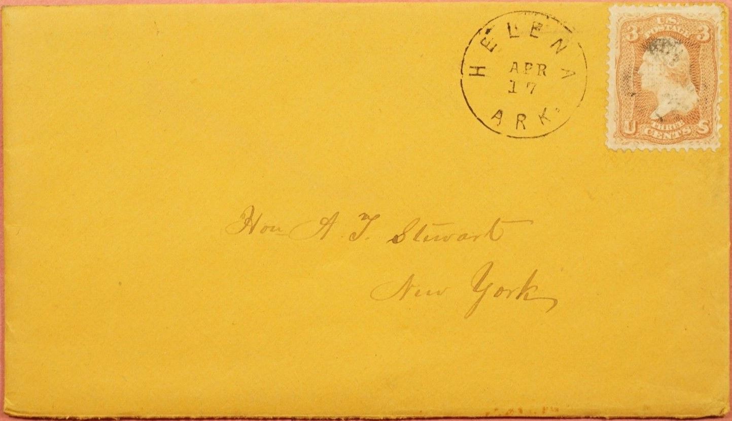 | Helena | 186x-04-17 | New York | Black CDS, Black cork cancels 3c adhesive on yellow envelope | Helena AR 186x-04-17 US 65 to New York eBay20181001.jpg |