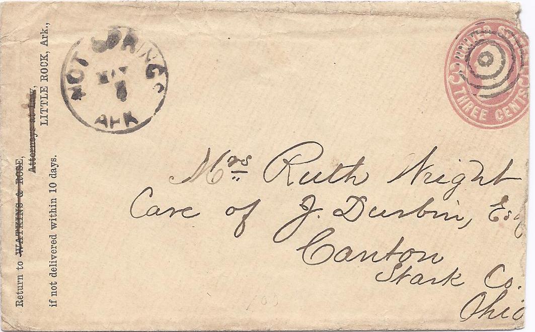 | Hot Springs | 186x-05-07 | Canton, Ohio | Black CDS, black target cancel ties 3c embossed envelope on whit envelope | Hot Springs AR 186x-05-07 eBay 20120924.jpg |