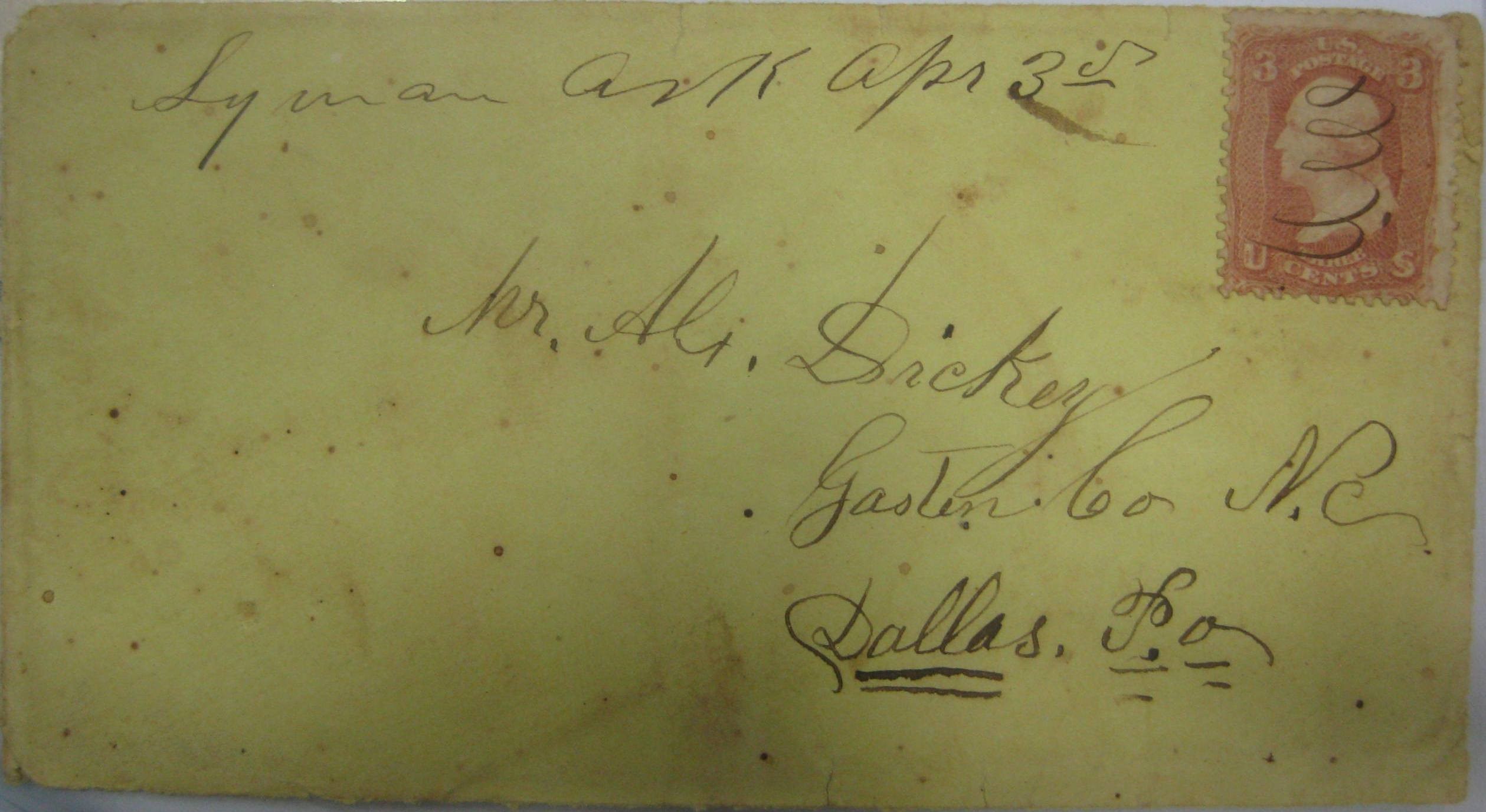 | Lyman | 186x-04-03 | Dallas North Carolina | Manuscript town name, pen cancelled 3 cent adhesive, white cover | Lyman AR 186x-04-03.JPG |