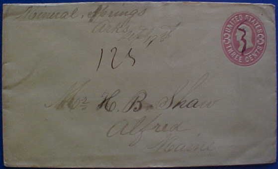 | Mineral Springs | 1868 | Alfred, Maine | Manuscript town name, pen cancelled 3 cent embossed white cover | Mineral Springs AR1868.jpg |