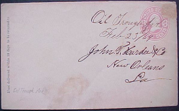 | Oil Trough | 1869-02-23 | New Orleans, Lousiana | Manuscript town name, pen cancelled 3 cent embossed white cover | Oil Trough AR 1869-02-23 3c Pink eBay20150415.JPG |