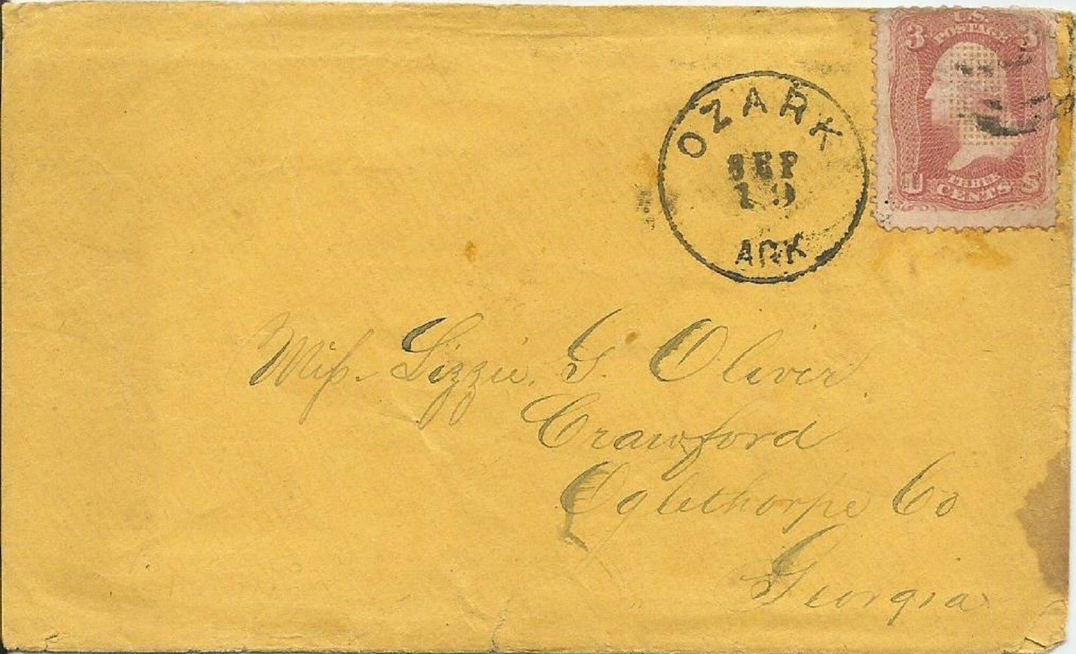 | Ozark | 186x-09-13 | Crawford, Geogia | Black CDS, black target cancel ties 3c grilled adhesive | Ozark AR 186x-09-19 US 94 to Georgia eBay20170702.jpg |