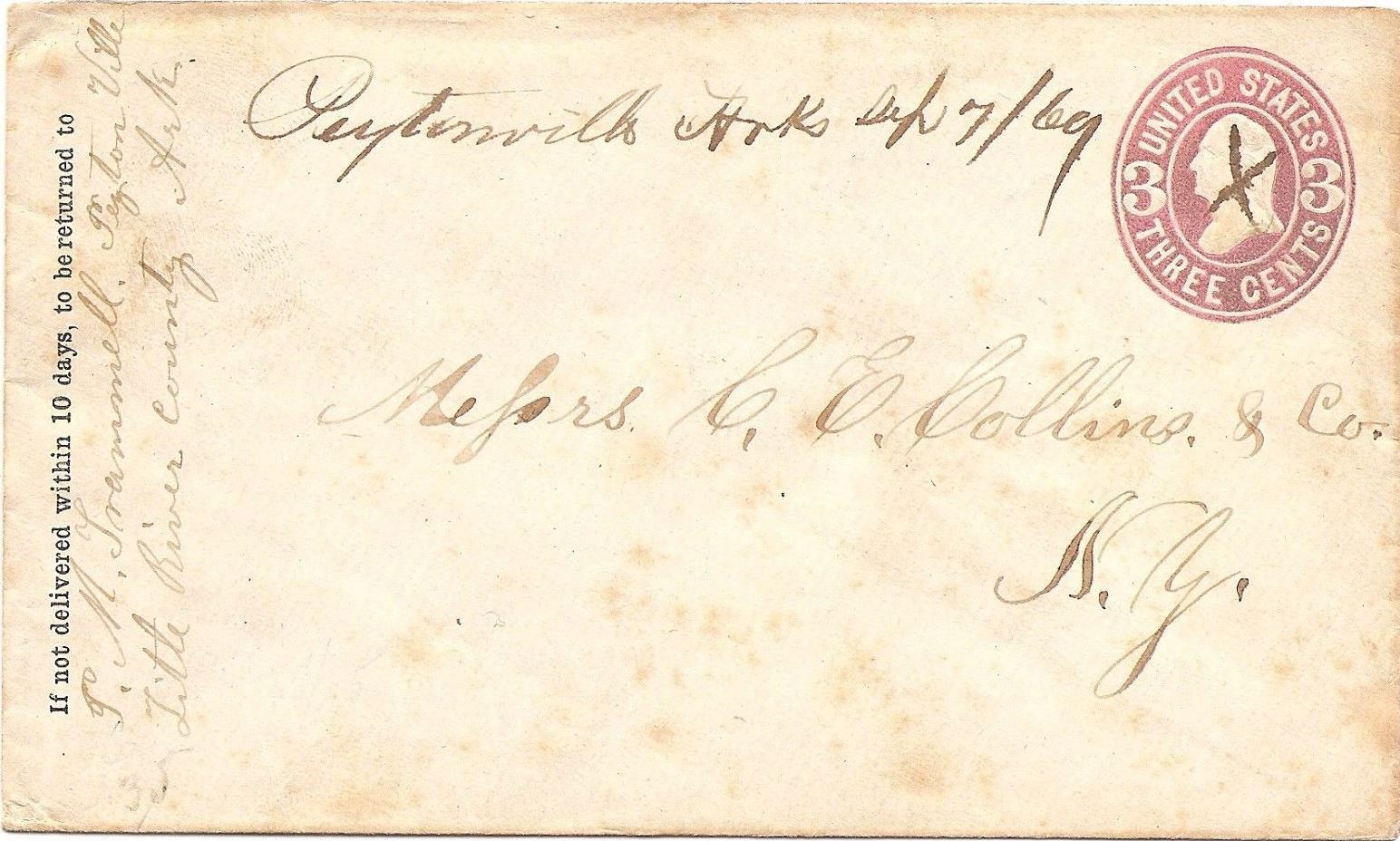 | Peytonville | 1869-09-07 | New York | Manuscript town name, pen cancelled 3 cent embossed white cover | Peytonville AR 1869-09-07 Pink 3c env. eBay20170930.jpg |