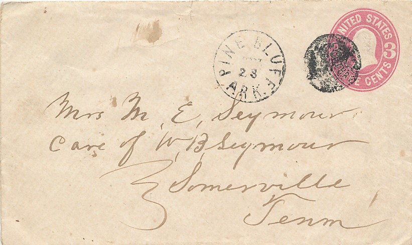 | Pine Bluff | 186x-x-23 | Somerville Tennessee | Black CDS, black cork cancel ties 3c embossed envelope on whit envelope | Pine Bluff 186x-x-23 3c Rose stationary eBay20181216.jpg |