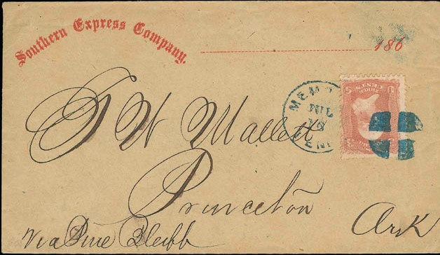 | Memphis, Tennessee | 186x-07-10 | Princeton Arkansas via Pine Bluff | Blue CDS, Blue cork ties 3c adhesive on Southern Express cover | RSiegel_Sale_927_Lot_1351.jpg |