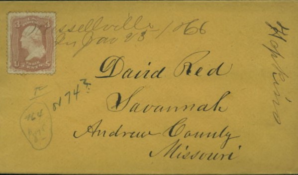 | Russellville | 1866-01-23 | Savannah, Missouri | Manuscript town name, pen cancelled 3 cent adhesive, yellow cover | Russelville AR 1866-01-23 eBAy 2012-03-10.jpg |