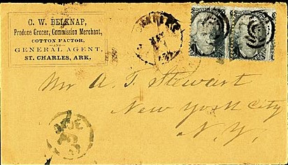 | Little Rock | 186x-08-23 | Memphis, Tennessee | Pair of 3c adhesives tied by black cork in LR, thrid 3c adhesive added and cancelled in Memphis | Little Rock AR 186x-08-23 rsiegel_sale_551_lot_1664.jpg |