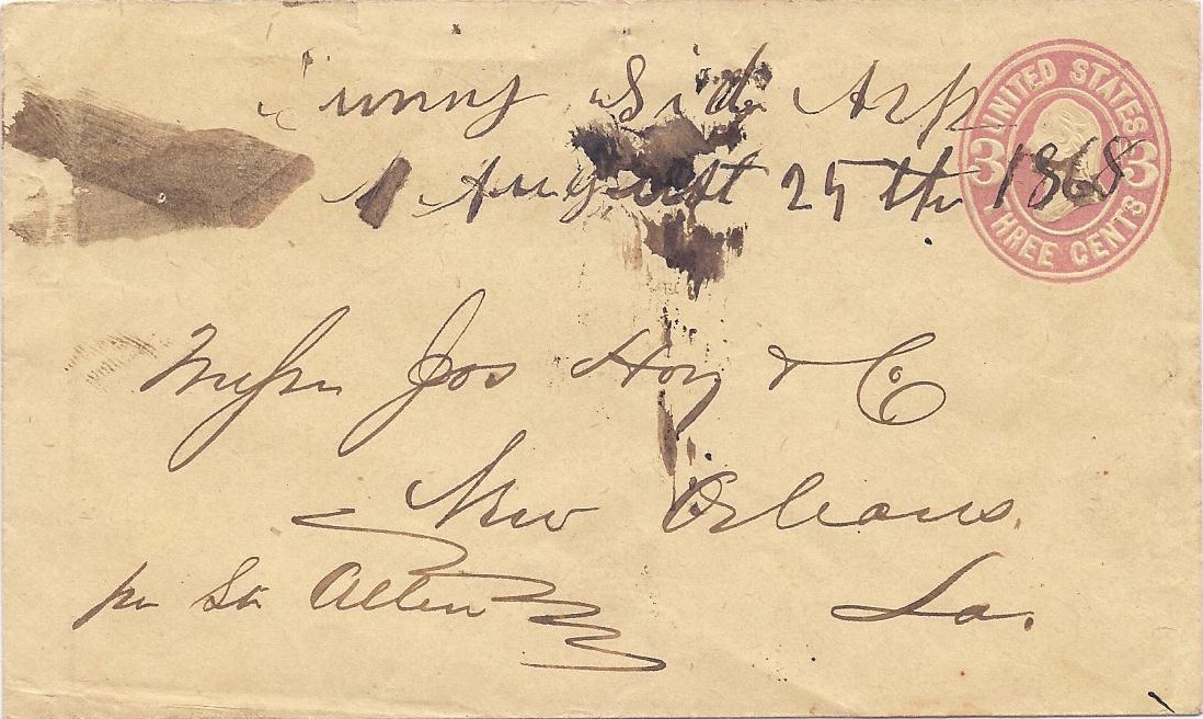 | Little Rock | 186x-05-22 | New Orleans, Lousiana | Black CDS, Cork Cancel ties 3c embossed envelope | Little Rock AR 186x-05-22 eBay 20120924.jpg |