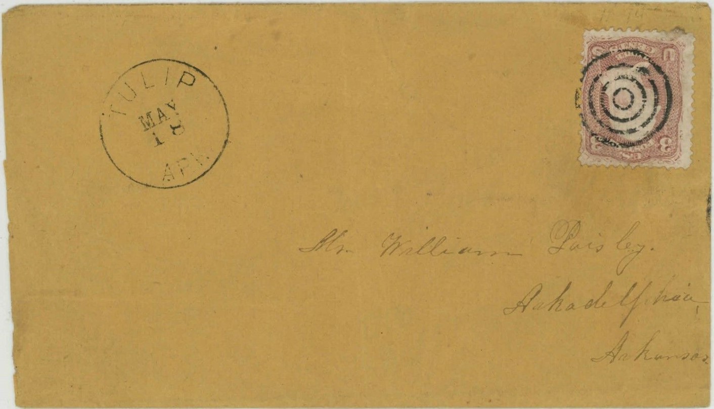| Tulip | 186x-05-18 | Arkadelphia, Arkansas | Black CDS, Scott 65 tied by 4-circle target cancel | Tulip AR 186x-05-18 eBay20220219.jpg |