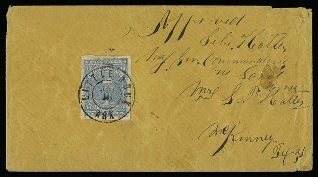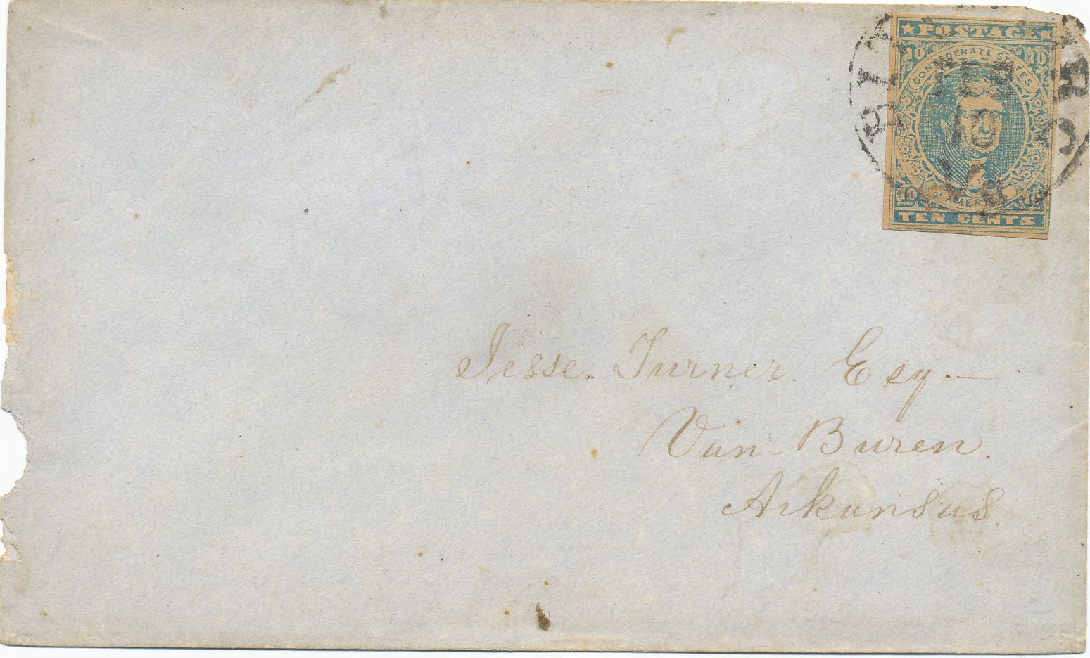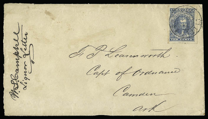 Except for Little Rock, there are very few Arkansas CSA post offices with reported usages of the first 10 cents adhesive issued by the Confederacy. This paid for letters over 500 miles and there was little correspondance over this distance from the smaller towns in Arkansas