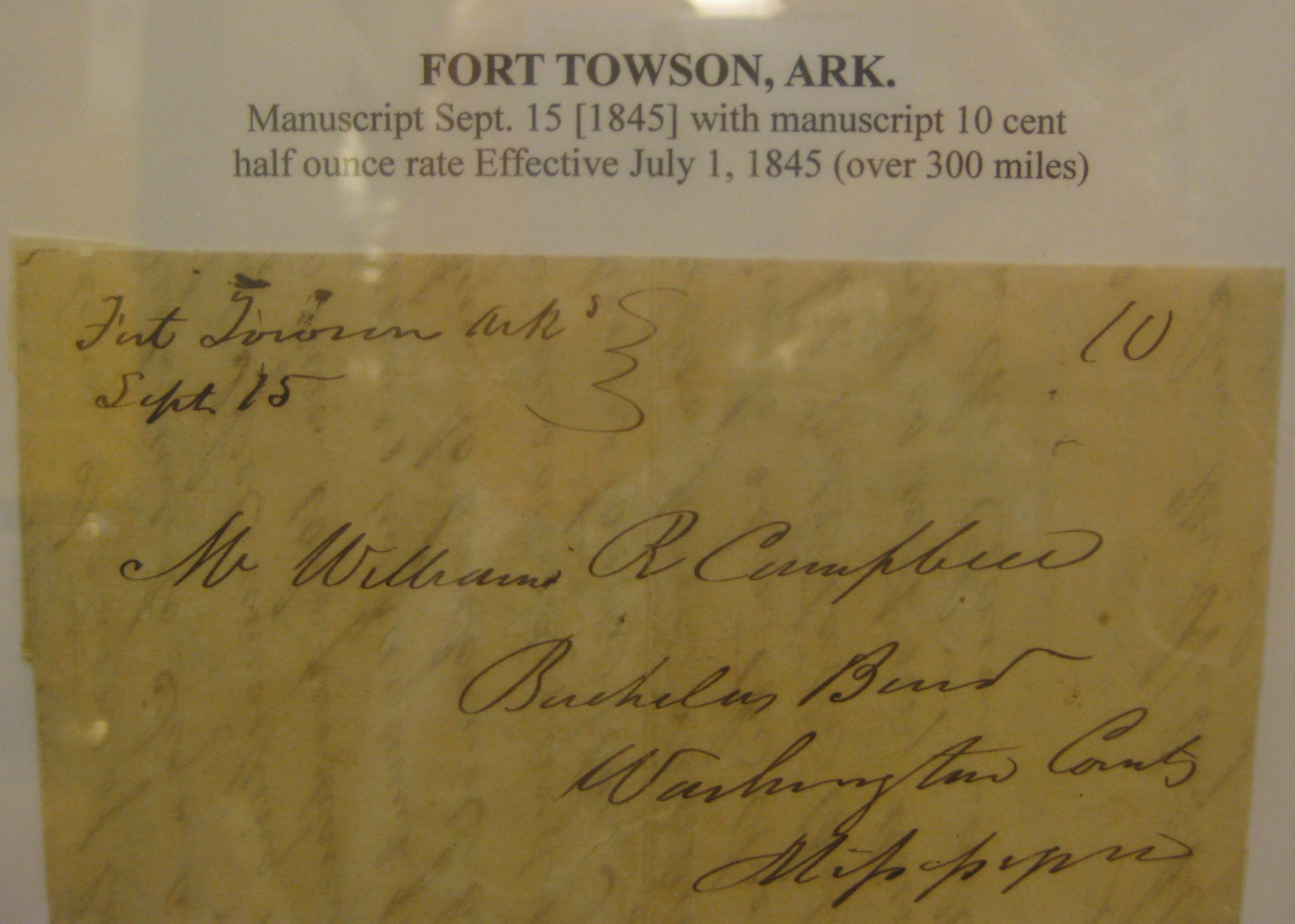 | 1845-11-03 | Washington DC | Black CDS, manuscript "10" (due) rate ms "O.P.S" To Gen Nathan Towson | Fort Towson AR 1845-11-03 SRumseySale55 Lot10.jpg |