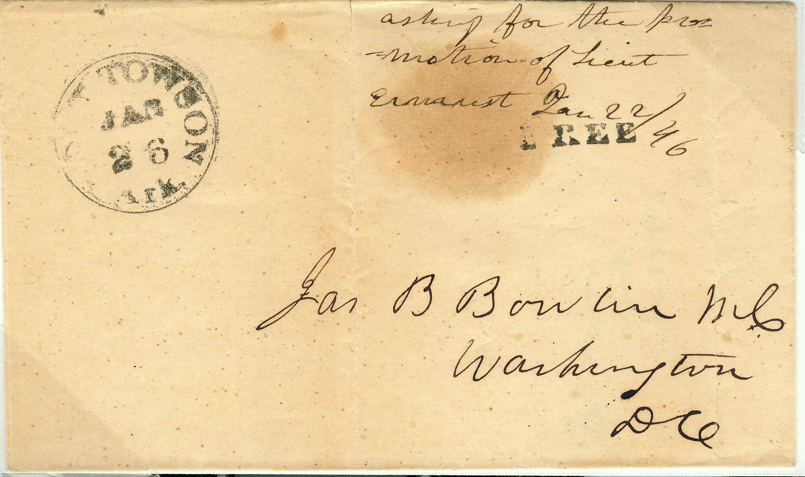 | 1846-01-26 | Washington DC to member of congress | Black CDS,FORT TOWSON/JAN/26/ARK black Hdsp FREE | Fort Towson Ark 1846-01-26 BRoberts Coll.jpg |